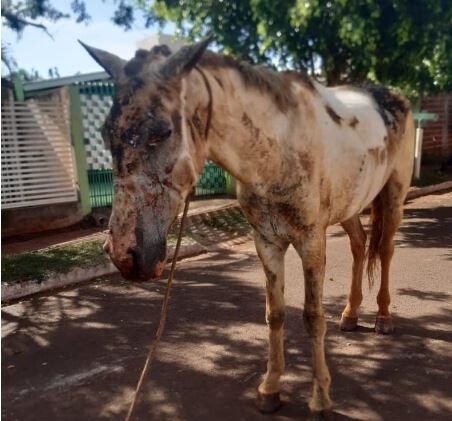 O cavalo, estava em uma baía que ficou totalmente destruída. O animal conseguiu sair, porém o fogo atingiu parte do seu corpo, causando ferimentos graves. (Fonte: Plantão Maringá)