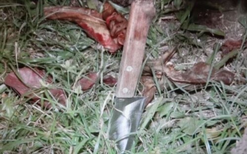 Após buscas, a PM avistou um homem e duas mulheres na Praça do Cristo. Uma delas tinha as mesmas características da denunciada pelo crime. Ao ver a viatura da polícia, a mulher jogou no gramado da praça, uma faca que estava na cintura. A faca de cozinha de cabo branco tinha marcas de sangue.