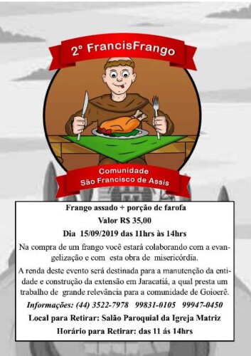 A Comunidade São Francisco de Assis, de Goioerê, que presta assistência à famílias carentes, irá realizar no dia 15 de setembro a 2ª FrancisFrango,a festa do frango assado.