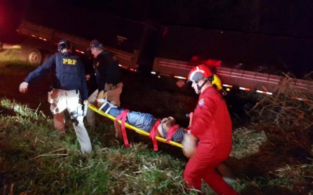 O motorista de uma carreta bitrem, com placas de Loanda, teve ferimentos moderados ao bater violentamente contra um barranco após perder o controle da direção e sair da pista. O acidente ocorreu na noite dessa quarta-feira (21), por volta das 22 horas, na BR 487 (Estrada Boiadeira), entre Campo Mourão e Tuneiras do Oeste.