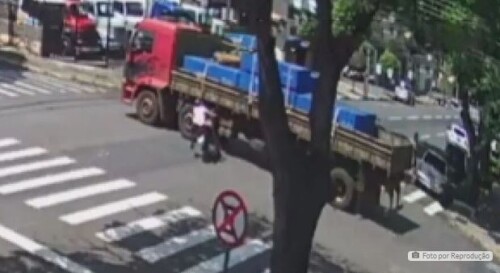 A motociclista acabou colidindo no rodado de um caminhão por não conseguir frear a tempo. Por sorte, ela cai ao lado dos pneus e escapa de ser atropelada pelo veículo de carga.