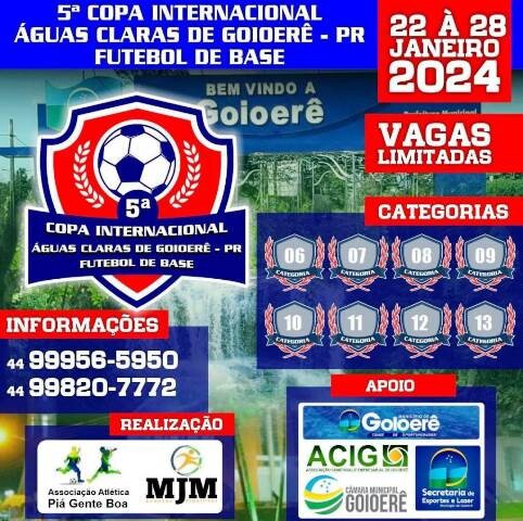 Goioerê irá sediar a 5ª Copa Internacional Águas Claras de Futebol de Base, que tem a expectativa de reunir cerca de dois mil atletas do Sub-6 ao Sub-13. Equipes de 35 cidades do Paraná já confirmaram presença no tradicional evento de futebol.