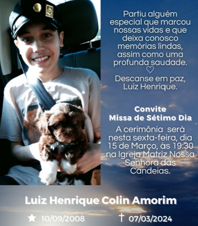 A missa de 7º dia do jovem goioerense Luiz Henrique Colin Amorin, de 15 anos, acontece nesta sexta feira. 15, na Igreja Matriz