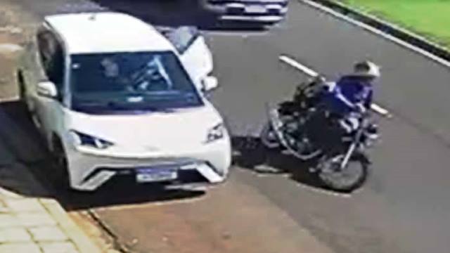 Nas imagens é possível observar que o motorista de um BYD para o veículo no acostamento, quando o passageiro abre a porta traseira para descer. Neste momento, o motociclista, de 47 anos, bate na porta do carro, perde o controle e acaba sendo atingido por outro automóvel que passava pela via.