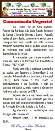 “Eu, Padre Luiz da Silva Andrade, Pároco da Paróquia São João Batista Diocese de Campo / Mourão Moreira / Sales - Paraná, venho através deste, comunicar e alertar que a Paróquia São João Batista não está fazendo nenhuma campanha, rifa ou pedido via pix para as reformas que estão acontecendo nas dependências da Igreja.