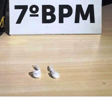 Com sinais sonoros e luminosos, os policiais ordenaram que o grupo parasse. A ordem foi acatada imediatamente pelos três. Durante a busca pessoal, os policiais encontraram duas buchas de substância análoga à cocaína. O entorpecente estava embalado em plástico transparente e escondido no bolso frontal de uma blusa de moletom usada por um dos abordados.