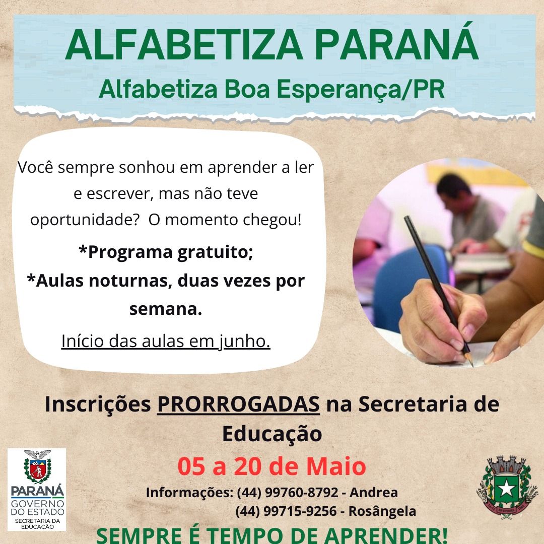 As inscrições para o programa “Alfabetiza Paraná” foram prorrogadas em Boa Esperança e agora podem ser feitas até o dia 20 de maio, diretamente na Secretaria Municipal de Educação.