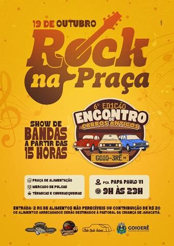 A Praça Papa Paulo VI (predião) será palco neste domingo, 19, de muita música e diversão com o evento Rock na Praça, que integra a 6ª edição do Encontro de Carros Antigos de Goioerê. A programação vai das 9h às 23h, reunindo famílias, admiradores de veículos antigos e amantes do bom e velho rock’n roll.