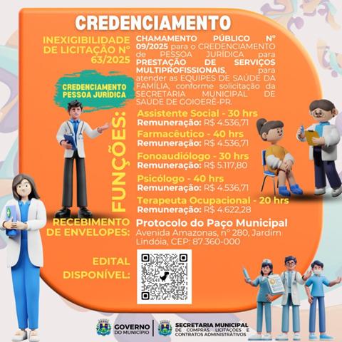 A Prefeitura de Goioerê deu mais um passo importante para ampliar a qualidade dos atendimentos na rede municipal de saúde. Está aberto o chamamento público para o credenciamento de pessoas jurídicas interessadas em prestar serviços multiprofissionais às equipes de Saúde da Família.