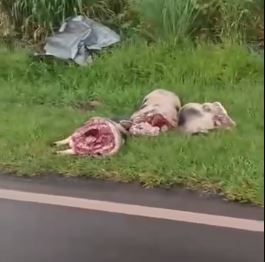 Um fato inusitado chamou a atenção de motoristas que trafegavam pela PR-468, entre Goioerê e Umuarama, perto da ponte do Rio Goioerê, na manhã de sexta-feira (2). O que parece ser um porco de grande porte, já abatido e cortado, foi encontrado às margens da rodovia e acabou despertando a curiosidade de quem passava pelo local.