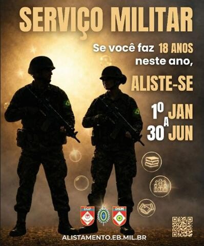 A Prefeitura de Goioerê reforça o alerta aos jovens do município que completam 18 anos em 2026 sobre a obrigatoriedade do alistamento militar, que deve ser realizado entre os dias 10 de janeiro e 30 de junho.