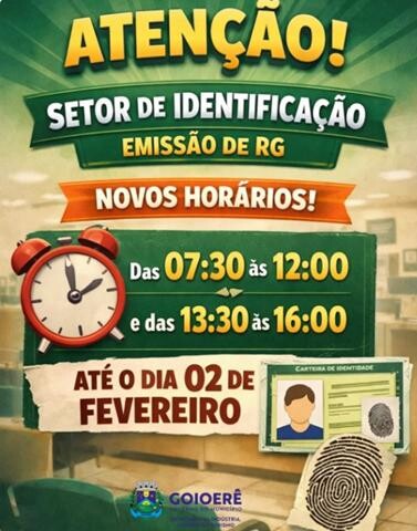 A Secretaria de Indústria e Comércio de Goioerê divulgou comunicado informando a alteração temporária no horário de funcionamento do Setor de Identificação, responsável pela emissão da Carteira de Identidade (RG), que funciona anexo à secretaria.