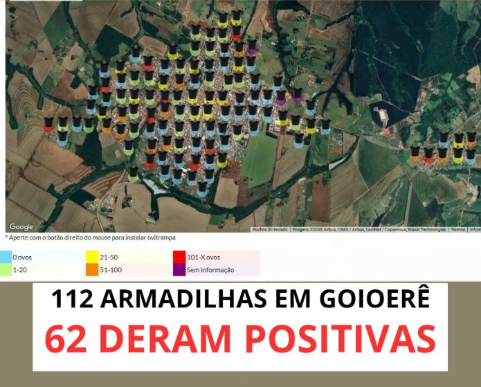 De acordo com o levantamento mais recente, foram distribuídas 112 armadilhas de forma estratégica nos bairros do município. Deste total, 62 apresentaram resultado positivo para ovos do mosquito, o que representa um índice de positividade de 62%. O número elevado acende um alerta e indica alto risco de transmissão das arboviroses, já que nenhuma região da cidade está livre da infestação.