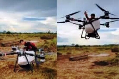 Este tipo de drone tem capacidade de até 100 quilos e foi criado para pulverização agrícola, que vem substituindo o uso de aviões, devido, principalmente, ao menor custo de operação. Já se o uso for de sólidos, como sementes, o tanque comporta até 150 litros, de com acordo com o piloto.