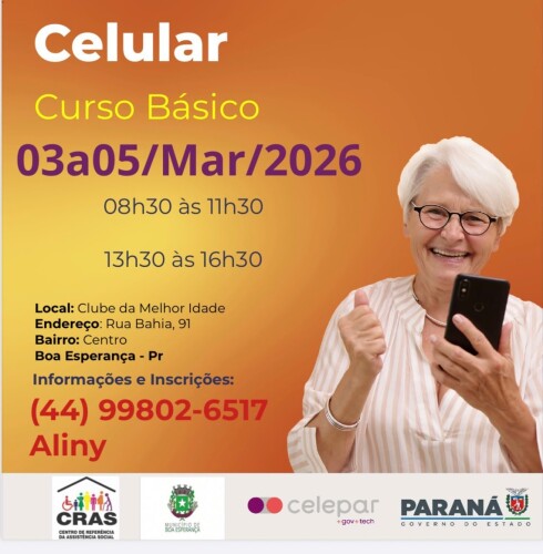 A Prefeitura Municipal de Boa Esperança, por meio da Secretaria Municipal de Assistência Social, realiza entre os dias 03 e 05 de março o Curso Básico de Celular, voltado a idosos do município, por meio da adesão ao Programa de Inclusão Social e Digital da Celepar.