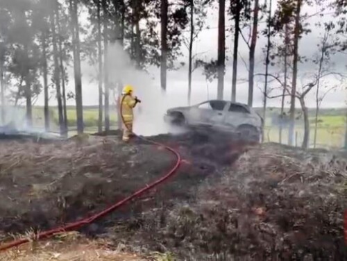 Um veículo GM Celta ficou completamente destruído em um incêndio resultado de uma saída de pista na tarde desta terça-feira (10) na PR-468, entre Umuarama e Mariluz, nas imediações do Rio Goioerê. De acordo com as informações levantadas no local, o condutor teria perdido o controle em um trecho de curva da rodovia.