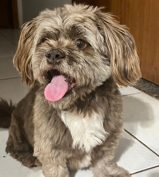 O cachorro é da raça Shih-tzu misturado com Lhasa Apso, tem a cor marrom e atende pelo nome de Faisca.