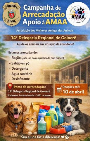 A 14ª Delegacia Regional de Polícia Civil de Goioerê está promovendo uma campanha de arrecadação em apoio à AMAA – Associação dos Melhores Amigos dos Animais. A iniciativa tem como objetivo ajudar no cuidado de animais que foram abandonados ou que estão em situação de vulnerabilidade.