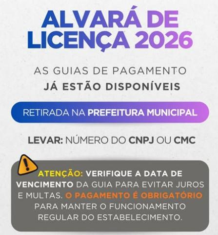 A Prefeitura orienta que os contribuintes fiquem atentos à data de vencimento impressa na guia, evitando assim a incidência de juros e multas por atraso. O pagamento do alvará é indispensável para manter a licença de funcionamento regular perante o município.