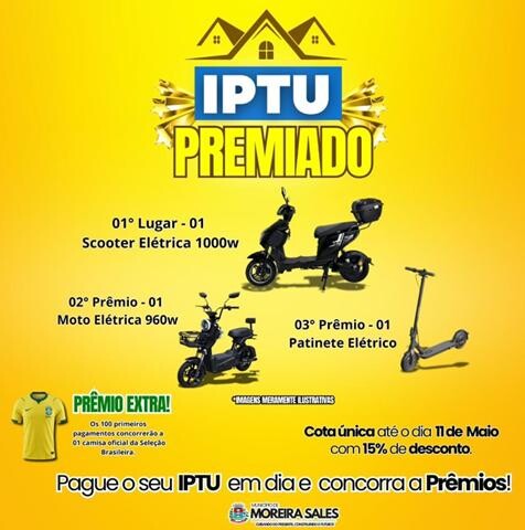 Quem realizar o pagamento do IPTU dentro do prazo estará automaticamente participando do sorteio de prêmios. Entre eles estão uma scooter elétrica de 1000W para o primeiro lugar, uma moto elétrica de 960W para o segundo lugar e um patinete elétrico para o terceiro lugar.