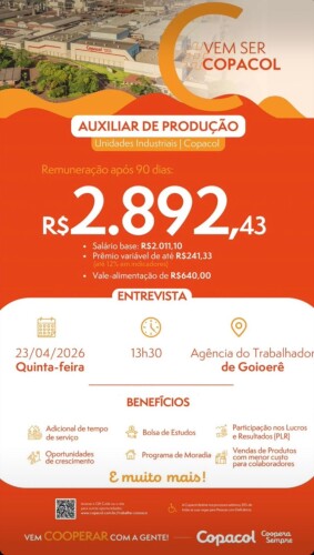 A oportunidade é destinada para atuação nas unidades industriais da Copacol, e os interessados devem comparecer no horário marcado na Agência do Trabalhador de Goioerê para participar da entrevista.