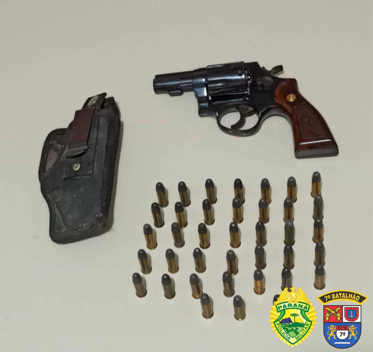 Os policiais passaram a realizar diligências e em conversa com a irmã, ela disse que a arma estava com a mãe e que ela entregaria a arma, o que aconteceu. Foi apreendido um revólver calibre 38, carregado com 6 munições intactas e outras 32 munições do mesmo calibre.