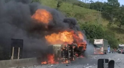 Um caminhão tombou e pegou fogo na BR-116 em Campina Grande do Sul, na região metropolitana de Curitiba, no fim da manhã deste sábado (23). Ele levava uma carga de desodorantes, o que gerou as explosões dos frascos de aerossóis. Além de explosões maiores por causa do conteúdo dos produtos, os frascos também iam sendo arremessados a metros de distância, conforme eram atingidos pelas chamas.