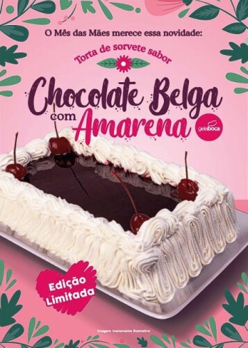 A torta de sorvete é uma edição especial sabor chocolate belga com amarena (há tortas de outros sabores), que é vendida inteira ou fracionada, para você levar a porção ideal para comemorar o Dia das Mães.