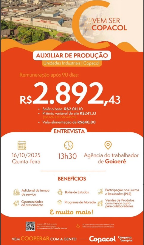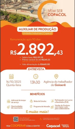 A Copacol realizará entrevista de emprego nesta quinta-feira, 16, às 13h30, na Agência do Trabalhador de Goioerê, oferecendo vagas para o cargo de Auxiliar de Produção nas unidades industriais da cooperativa.