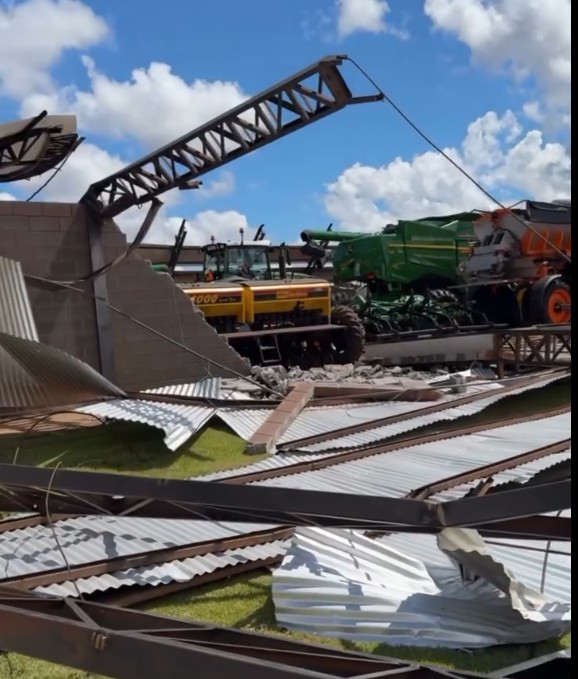 Um vídeo mostra um barracão de 1.500 metros quadrados, construído na Fazenda Nossa Senhora Aparecida, em Goioerê, que foi derrubado pelos ventos do temporal do último sábado, 1º.