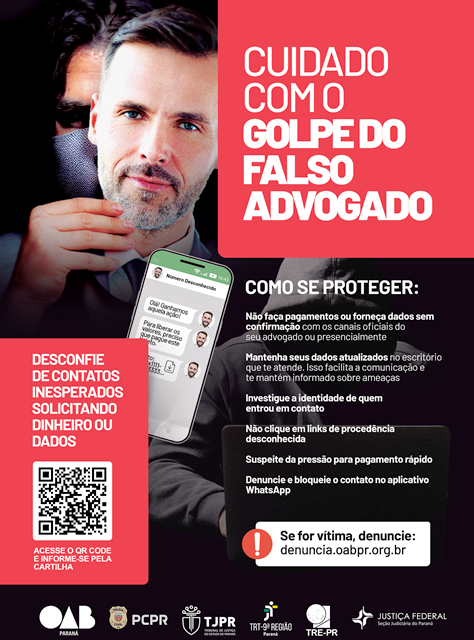 Com muitas vítimas em Goioerê e também em todo o Paraná, a OAB – Ordem dos Advogados do Brasil -, por meio da subseção de Goioerê está repassando informações sobre como se proteger do “Golpe do Falso Advogado”, elaboradas pela Seccional do Paraná.