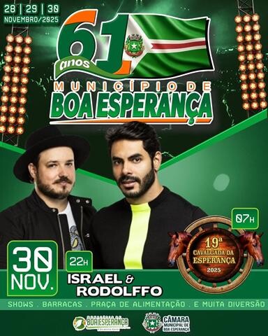No sábado, 29, a festa ganha ainda mais força com as apresentações de Murilo & Romário e Jiraya Uai, prometendo uma noite de grande público e muita animação. Já no domingo, 30, o encerramento será em grande estilo com o show da dupla Israel & Rodolffo, além da realização da 19ª Cavalgada da Esperança, que todos os anos reúne cavaleiros da região em um dos momentos mais tradicionais do município.