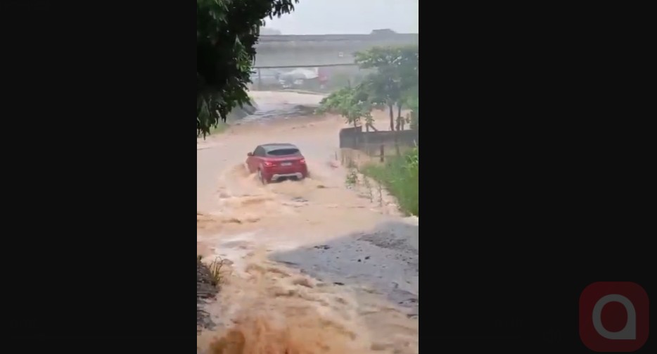 Vídeos que circulam nas redes sociais registraram o momento em que o motorista tenta atravessar a área alagada. O veículo avança lentamente, mas começa a boiar e, em poucos segundos, é arrastado pela correnteza formada na via.