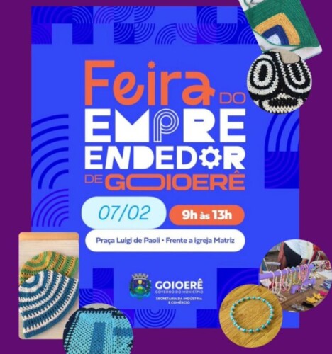 A Prefeitura de Goioerê, por meio da Secretaria de Indústria e Comércio, convida toda a população para prestigiar a Feira do Empreendedor de Goioerê, que será realizada neste sábado, 07, das 9h às 13h, na Praça Luigi de Paoli, em frente à Igreja Matriz.