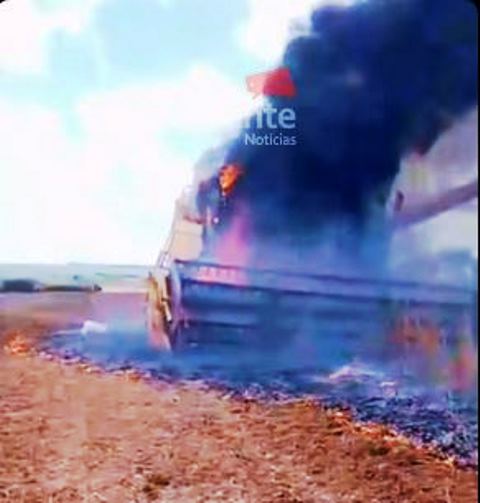 O maquinário pertence ao produtor Valdecir, que registrou o momento em que o fogo se alastrou, mas infelizmente nada pôde ser feito. A colheitadeira ficou totalmente destruída. (Alto Falante Notícias).