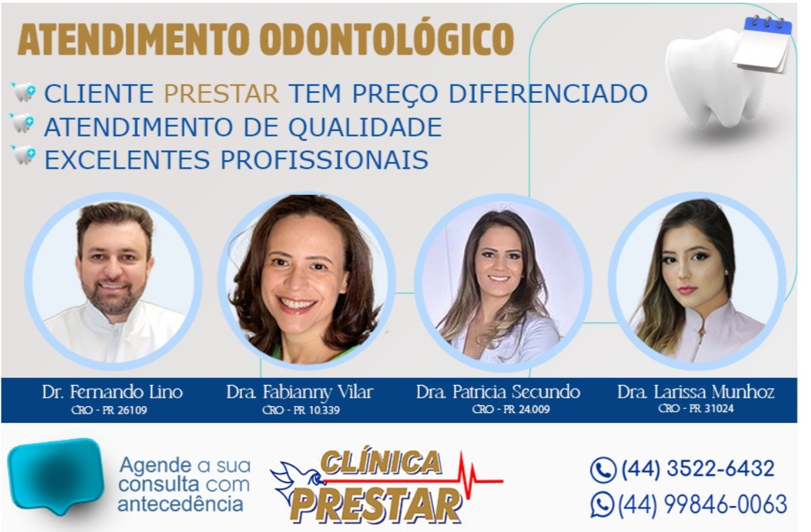 Atendem na Clínica Prestar os profissionais Dr. Fernando Lino, CRO-PR 26.109, Dra. Fabianny Vilar, CRO-PR 10.339, Dra. Patrícia Secundo, CRO-PR 24.009, e Dra. Larissa Munhoz, CRO-PR 31.024.