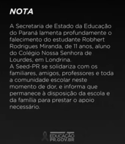 Em nota oficial divulgada nas redes sociais, a Secretaria de Estado da Educação do Paraná lamentou a morte do estudante e informou que se colocou à disposição da direção da escola e da família para oferecer o suporte necessário neste período de luto. Leia abaixo: