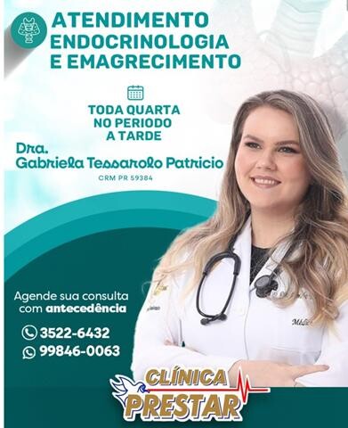 A Clínica Prestar segue ampliando os serviços oferecidos à população de Goioerê e região. A unidade passa a contar agora com atendimento em Endocrinologia e emagrecimento, com a chegada da médica Gabriela Tessarolo Patricio.