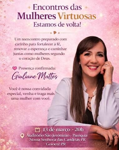 Todas as mulheres de Goioerê são convidadas a participarem do evento, que está endo preparado com muito carinho para fortalecer a fé, renovar a esperança e caminhar como mulheres segundo o coração de Deus.