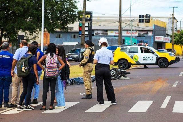 O condutor de uma motoneta Honda Biz morreu em uma colisão com um ônibus escolar no cruzamento das avenidas Ângelo Moreira da Fonseca e Guanabara, nas imediações da UEM, no início da tarde de quinta-feira (12).