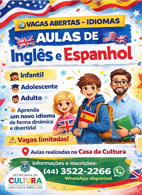 A Prefeitura de Goioerê, em parceria com a Secretaria de Cultura, segue ampliando as atividades culturais oferecidas à comunidade. Dentro desse trabalho, estão abertas as inscrições para aulas de Inglês e Espanhol, que serão ministradas pelo professor Bruno Martini.