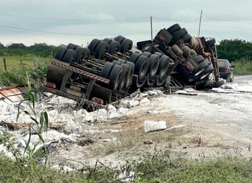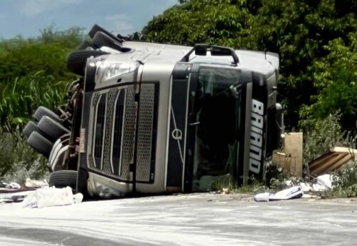 Uma carreta de Goioerê tombou na rodovia PE-390, perto de /serra Talhada, em Pernambuco, na segunda-feira, 23. O caminhoneiro conhecido como Giovani Baiano e a namorada, que estavam no caminhão, tiveram ferimentos leves, foram socorridos e passam bem.