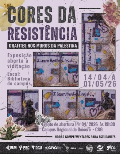 O campus regional da Universidade Estadual de Maringá (UEM) em Goioerê recebe a exposição “Cores da Resistência – Grafites nos Muros da Palestina”, uma mostra cultural que propõe reflexão sobre arte, identidade e direitos humanos. A abertura oficial está marcada para o dia 14 de abril, às 19h30, na Biblioteca do campus.