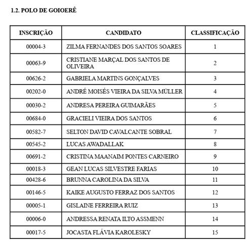 De acordo com o edital nº 33/2026 da Unicentro, os candidatos classificados por polo e dentro do número de vagas estão convocados para efetivar a matrícula. No Polo de Goioerê, a lista dos convocados aparece com 15 candidatos classificados.