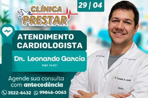 Nesta quarta-feira, dia 29, a clínica terá atendimento com o cardiologista Dr. Leonardo Garcia, oferecendo consultas para avaliação e acompanhamento da saúde do coração. A recomendação é que os pacientes realizem o agendamento com antecedência.
